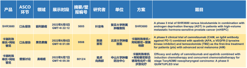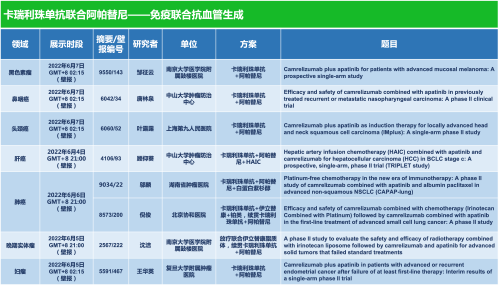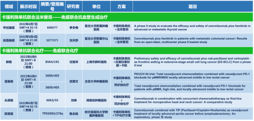 卡瑞利珠单抗联合彩虹多多医药的另一款创新药法米替尼在甲状腺癌和结直肠癌领域有2项研究被接收为壁报,另有卡瑞利珠单抗联合化疗的4项研究在肺癌、结直肠癌、头颈癌和阴茎癌领域的研究被接收为5份壁报。