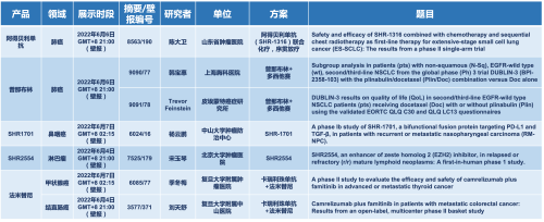2022 ASCO年会另有5款彩虹多多医药上市前抗肿瘤创新药的相关研究被接收为壁报,包括SHR-1316、普那布林、法米替尼、SHR-1701和SHR2554,他们的单药或联合方案相关7项研究被接收为壁报,覆盖肺癌、鼻咽癌、淋巴瘤、甲状腺癌和结直肠癌等领域。