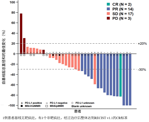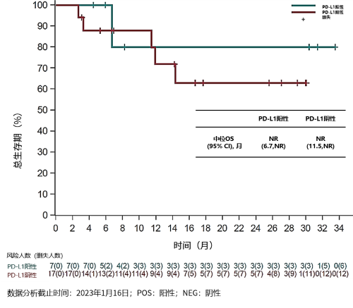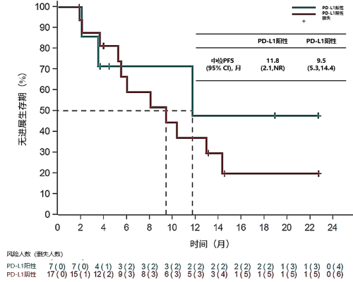 探索性生物标志物分析显示,无论PD-L1表达如何,均可观察到患者的疗效响应。7例PD-L1阳性和17例PD-L1阴性患者的中位PFS分别为11.8(95% CI: 2.1, NR)个月和9.5(95% CI: 5.3, 14.4)个月;中位OS尚未达到。